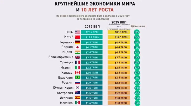 ⚡️📊🪙🌎 Сравнительный анализ ВВП крупнейших стран мира в динамике, то есть с 2015 по 2025 г.г. Как мы видим, Китай и Индия демонстрируют самые впечатляющие показатели. Неплохие цифры у Южной Кореи, а