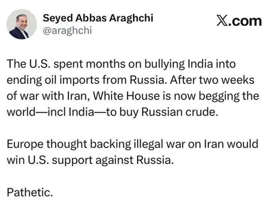 ⚡️🐦🛢🇷🇺🇪🇺🇺🇸🇮🇷 Министр иностранных дел Ирана Аббас Аракчи : ❗️США месяцами давили на Индию, чтобы та прекратила импорт нефти из России. После двух недель войны с Ираном Белый дом теперь умоля