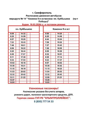 🚌 В Симферополе введено тестовое расписание маршрутов №14 и №88 ✅ С 16 марта 2026 года на маршрутах, обслуживающих Каменский массив и микрорайоны, прилегающие к улице Беспалова, действует тестовое р
