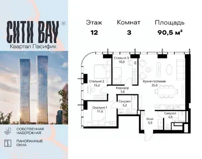 Новый лот на продажу ⚡️⚡️ 3-комнатная квартира 90,5 м² в ЖК Сити Бэй, квартал Пасифик. 12 этаж из 59, потолки 2,85. Квартира от застройщика, прямая продажа. Формат правильный - большая трешка с видом