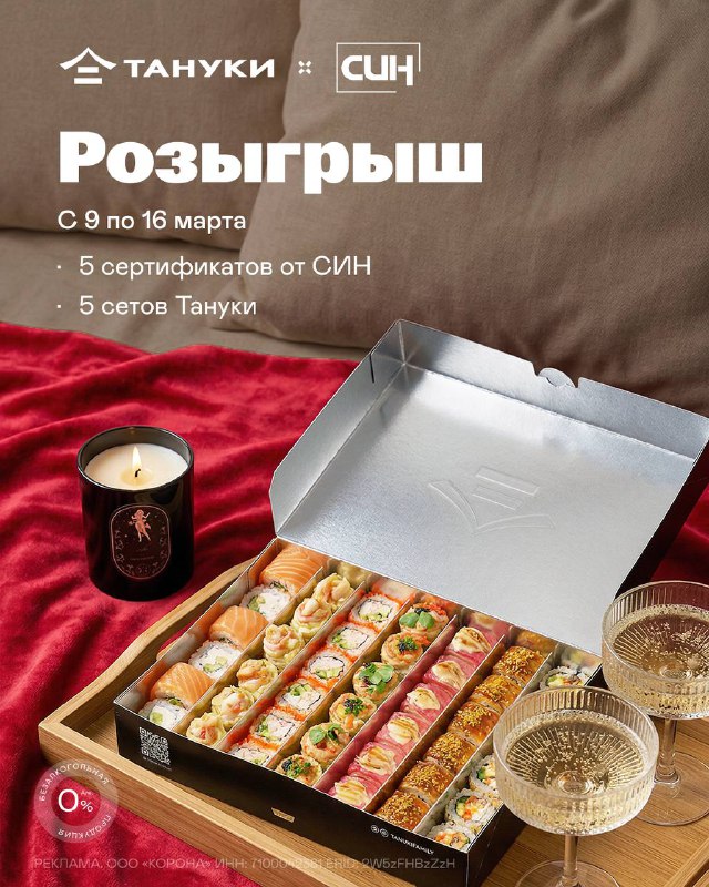 КОНКУРС от Тануки и СИН 😍 🥂 Доставка роллов, еще и в уютной обстановке дома? Мы поможем с эстетичной сервировкой и вкусным ужином! Разыгрываем пять наборов: • 5 сертификатов от СИН на сумму 5.00