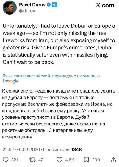 Павел Дуров заявил, что покинул Дубай и уехал в Европу При этом, Дуров заявил, что с нетерпением ждёт возвращения назад. Также, что «учитывая уровень преступности в Европе, Дубай статистически безопа