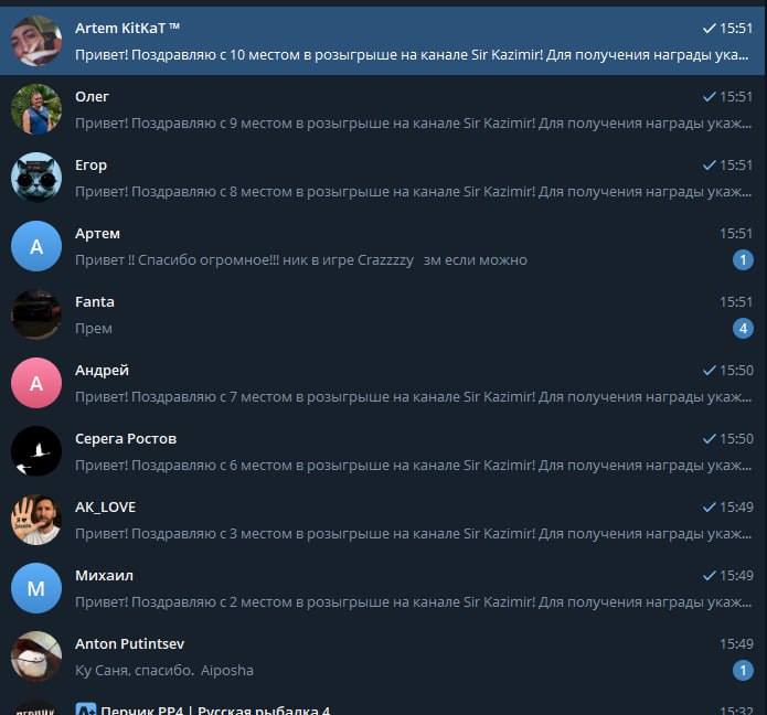 🎉 Результаты розыгрыша: 🏆 Победители: 1. Anton Putintsev (@putincev) 2. Михаил (@parmen38) 3. АК_LOVE (@ZAHARIKSSSS) 4. Артем (@ArtemTLT_163rus) 5. Fanta (@FAFAMEN) 6. Серега 7. Андрей (@andr1477)