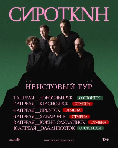 Дорогие слушатели, к сожалению, наши концерты в Красноярске, Иркутске, Хабаровске и Южно-Сахалинске пришлось отменить по организационным причинам. Нам очень жаль, что в этот раз мы не сможем сыграть д