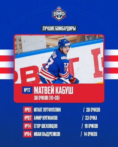 👍 Настало время постепенно подводить итоги сезона, и начнём мы, конечно, с самых результативных игроков! Лучшим бомбардиром «СКА-ВМФ» в сезоне 2025/26 стал нападающий Матвей Кабуш. На его счету 36