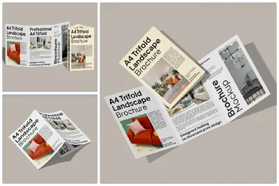 Макет A4 тройного буклета Три PSD‑файла 4000×3000 px демонстрируют буклет формата A4 в ландшафтной ориентации. Макет показывает реалистичные сгибы и текстуру бумаги, панели и фон легко редактируются