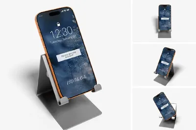 Макет телефона на подставке Четыре PSD‑файла 4500×3000 px предлагают реалистичную демонстрацию смартфона на держателе. Смарт‑слои позволяют быстро обновить дизайн, фон и освещение регулируются, а орг
