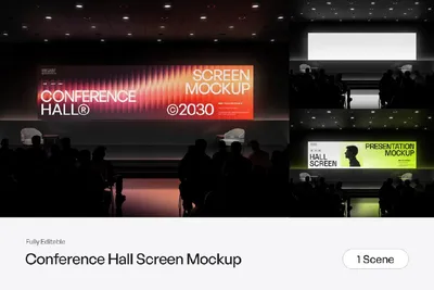 Макет экрана конференц‑зала PSD‑файл 4000×3000 px демонстрирует широкоформатный экран в зале для конференций. Реалистичная сцена включает сцену, световое оформление и силуэты зрителей. С помощью смар
