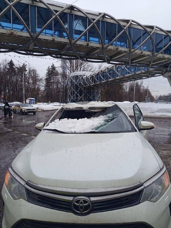 С пешеходного моста в Химках ледяная глыба упала на проезжающий автомобиль😱 Всё произошло на кругу возле ТЦ «Лига». К счастью, люди в салоне целы. 🌐Подпишись на ВК 🔵Подпишись на наш ТГ 🇷🇺Подпиш