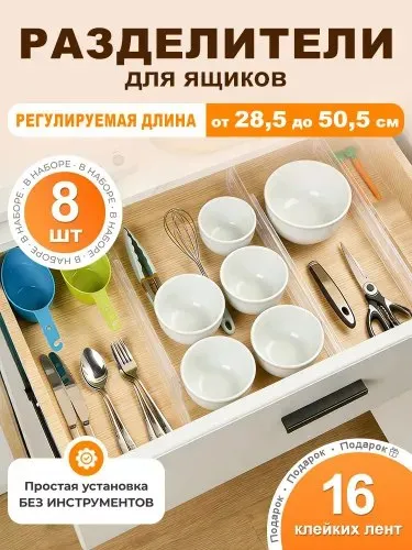 разделитель для ящиков;8шт/регулируемая длина от 28,5 до 50,5 см. Высота 8, Органайзер для столовых приборов Цена новая: 899р Цена старая: 5975р Скидка: 85% s1 Ссылка на этот т