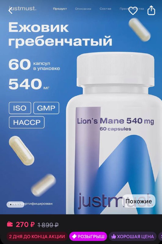 JUSTMUST Ежовик гребенчатый 540 мг в капсулах☀️ https://www.wildberries.ru/catalog/278543420/detail.aspx?size=428385133 Определённо👉 Скидка найдена! Мы в MAX 🔗 Все наши каналы