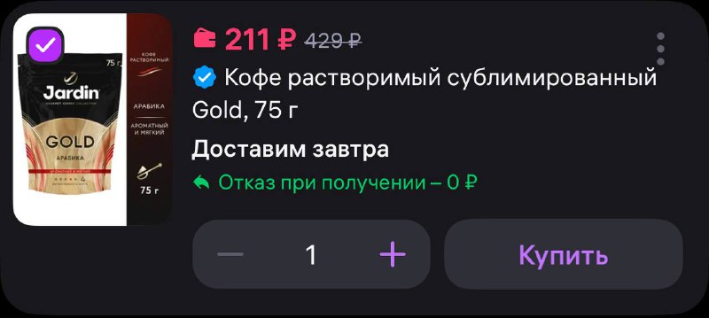 JARDIN Кофе растворимый сублимированный Gold, 75 г ☕️ https://www.wildberries.ru/catalog/139623544/detail.aspx?size=236915866 Определённо👉 Скидка найдена! Мы в MAX 🔗 Все наши каналы