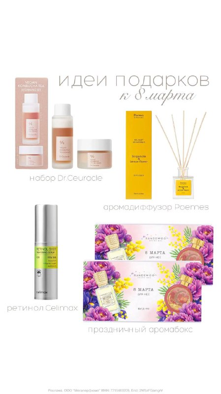 Идеи подарков на 8 марта 💕 🟠ароматы для дома - стильные аромадиффузоры Poemes 🟠уходовые средства - набор с комбучей Dr.Ceuracle или самый желанный ретинол от Celimax, красивые уходовые наборы с к