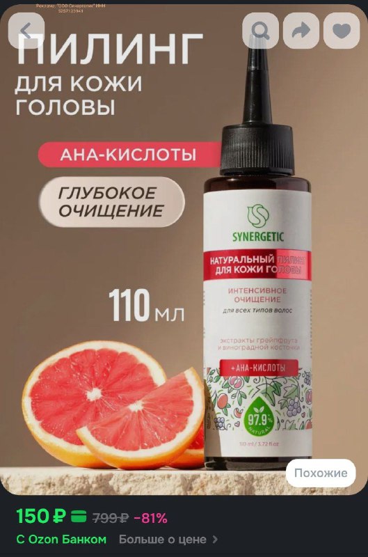 Натуральный пилинг для кожи головы SYNERGETIC c AHA-кислотами, 110 мл https://ozon.ru/t/hoNUM4y