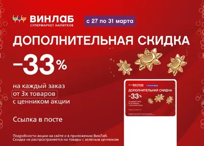 Скидка 33% в ВинЛаб С 27 по 31 марта в ВинЛаб действует дополнительная скидка 33% при покупке от 3-х товаров, участвующих в акции по ссылке https://winelab.prfl.me/skidki_market_free/l415su 🔗 Подр