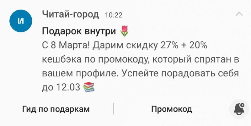 Читай-город раздал личные промокоды на скидку 27% и кеш 20%. Ищите его в разделе «промокоды» в профиле. Действует до 12.03