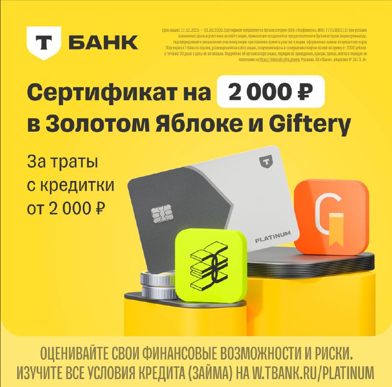 🙂 Сертификат на 2⃣0⃣0⃣0⃣💰 в Золотое Яблоко в подарок от Т-Банка 😍 Оформляйте карту Платинум, потратьте 2000 ₽ в течение месяца, и получите: 💜Сертификат на 2000₽ в Золотое Яблоко или Giftery 💜БЕС