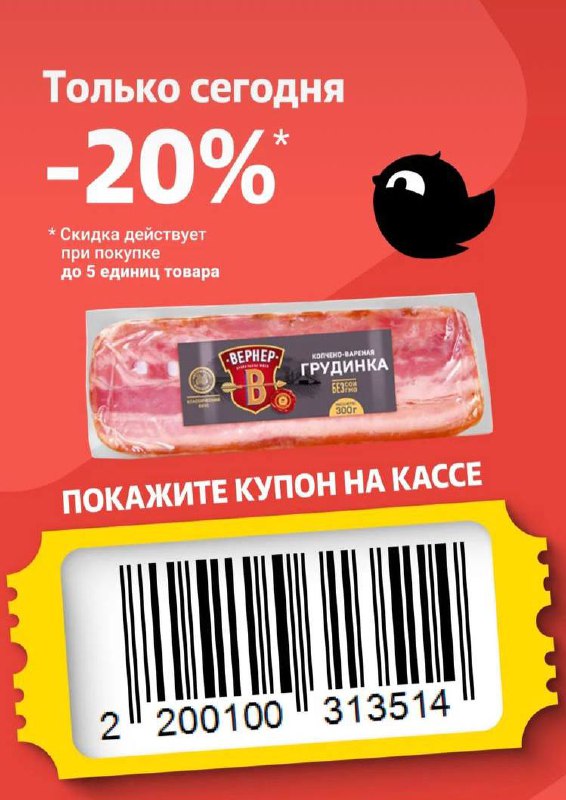 🐦 Товар дня в Чижике Грудинка копчено-вареная со скидкой 20% по купону за 💰175₽ Купоны многоразовые - делитесь с близкими 💔