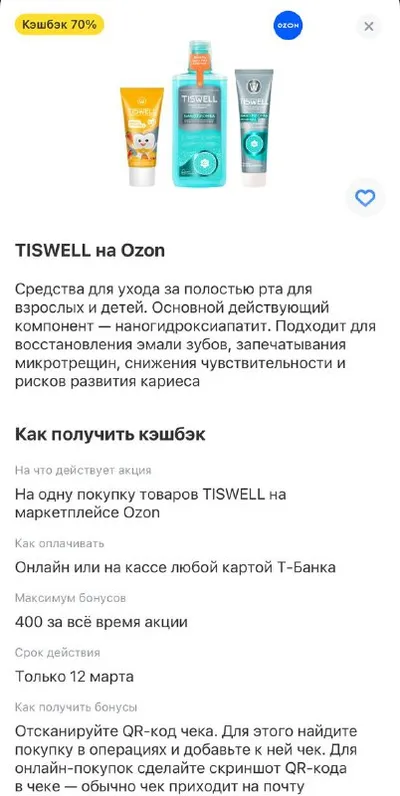 💞 Т-БАНК 💞 Tiswell на Ozon- кешбэк 70%, максимум 400 бонусов Делитесь находками с близкими💔