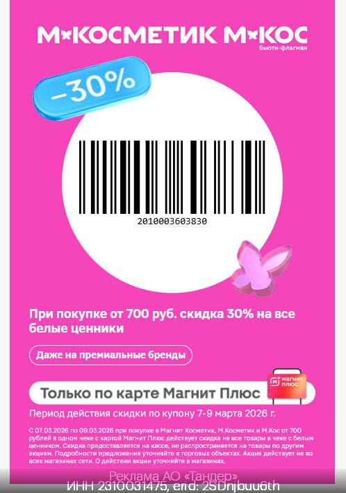 🏬 Купон в М. Косметик только по 09.03 1. Покажите на кассе «Магнит Косметик» купон с фото или откройте по ссылке https://gtblg.ru/cyons?erid=2SDnjbuu6th. 2. Получайте скидку 30% от 700₽ на все товар
