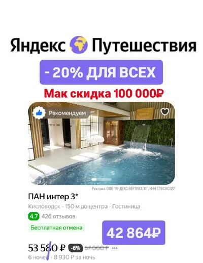 🌍 Яндекс Путешествия ❗️ ТОЛЬКО СЕГОДНЯ 🟣 PF-MARCH2O26-DKPPX Скидка 20% ДЛЯ ВСЕХ на одно бронирование отеля и иного жилья (максимальная сумма скидки 50000₽) ❗️ распространяется на бронирования с