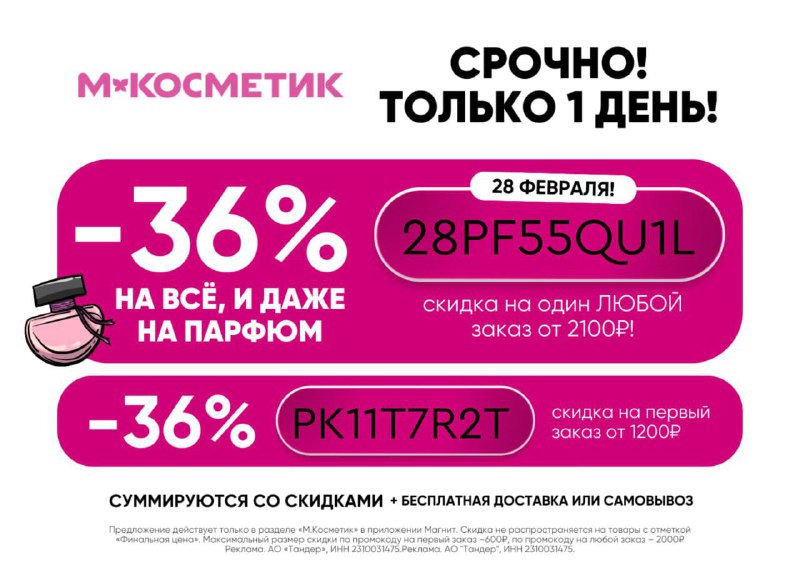 ✅ М.Косметик Вводите промокод: 👉🏻 PK11T7R2T — скидка 36% от 1200 ₽ на первый заказ в М.Косметик в приложении «Магнит Доставка» 👉🏻 28PF55QU1L — скидка 36% на любой заказ от 2100 ₽ в М.Косметик в