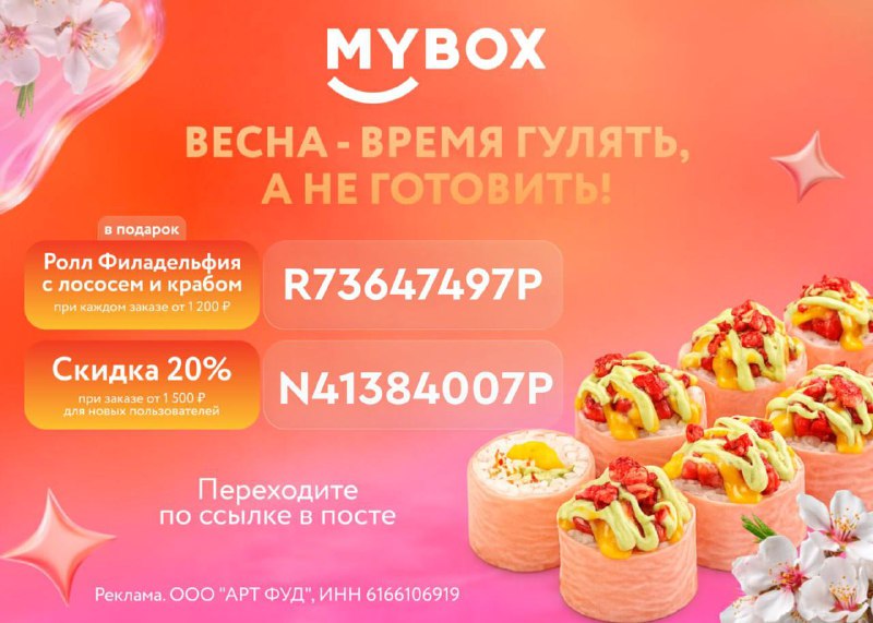 ✅ Промокоды в MYBOX Вводите промокод: 👉🏻 N41384007P — скидка 20% для новых клиентов при заказе от 1500 ₽. 👉🏻 R73647497P — «Ролл Филадельфия с лососем и крабом» в подарок при каждом заказе от 1200