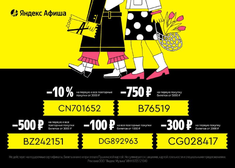 ✅ Яндекс Афиша Вводите промокод: 👉🏻 BZ242151 — скидка 500₽ на первую и все повторные покупки билетов от 3000₽ 👉🏻 CN701652 — скидка 10% на первую и все повторные покупки билетов от 3000₽ 👉🏻 DG89