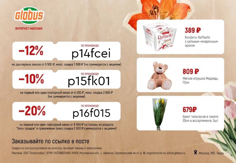 ✅ ГЛОБУС Вводите промокод: 👉🏻 p14fcei — скидка 12% на два первых заказа от 5500 ₽, не суммируется с акциями (максимальная скидка 1000₽) 👉🏻 p15fk01 — скидка 10% на первый или один повторный заказ