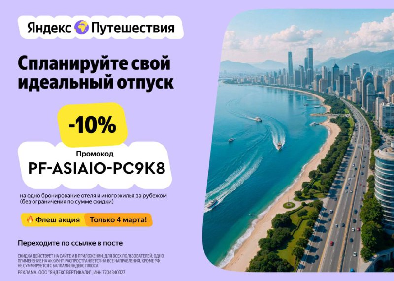 ✅ Яндекс Путешествия Вводите промокод: 👉🏻 PF-ASIAIO-PC9K8 — скидка 10% на одно бронирование отеля или иного жилья за рубежом (без ограничения по сумме скидки) Переходите по ссылке и бронируйте
