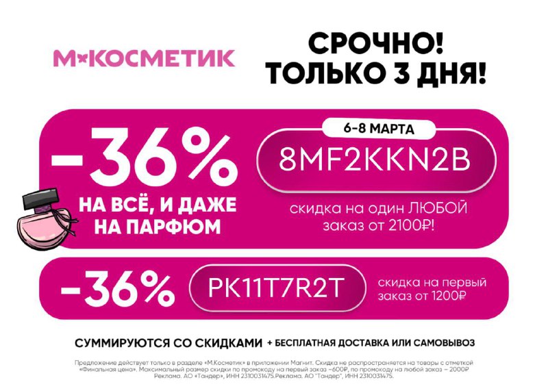 ✅ М.Косметик Вводите промокод: 👉🏻 PK11T7R2T — скидка 36% от 1200 ₽ на первый заказ в М.Косметик в приложении «Магнит Доставка» 👉🏻 8MF2KKN2B — скидка 36% на любой заказ от 2100 ₽ в М.Косметик в п