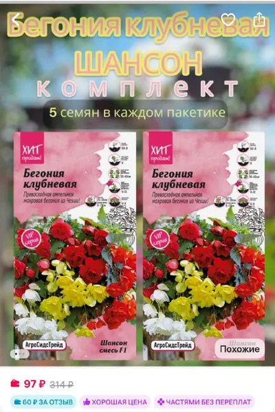 Агросидстрейд Бегония Клубневая Шансон комплект https://www.wildberries.ru/catalog/334755735/detail.aspx?size=500293691 Ставь ❤️ если понравилось