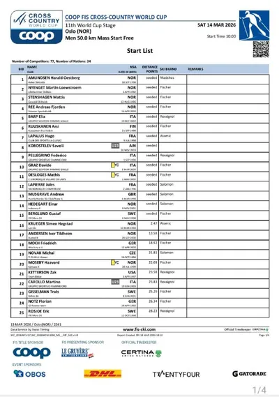Стартовые протоколы🎿 Кубок мира в Осло🏆🇳🇴 ✅14 марта ⛷12:00 МСК - Марафон 50 км, свободный стиль. Мужчины ⛷12:45 МСК - Марафон 50 км, свободный стиль. Женщины 🇷🇺Савелий Коростелев заявлен под