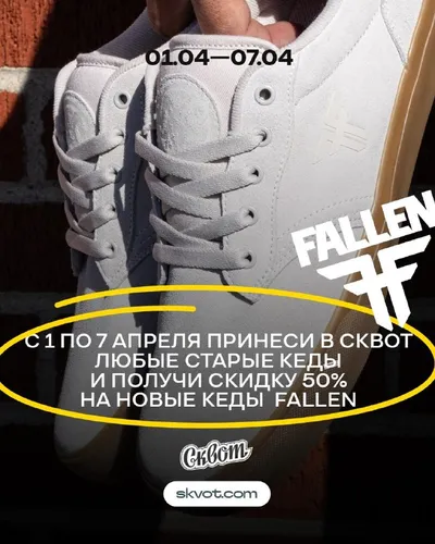 Ты нам повидавшие жизнь кеды - мы тебе скидку 50% на новые 👟 С 1 по 7 апреля принеси любую старую пару кед и забирай новые Fallen за полцены* 🤑 *Скидка расcчитывается от полной стоимости. Акция ра
