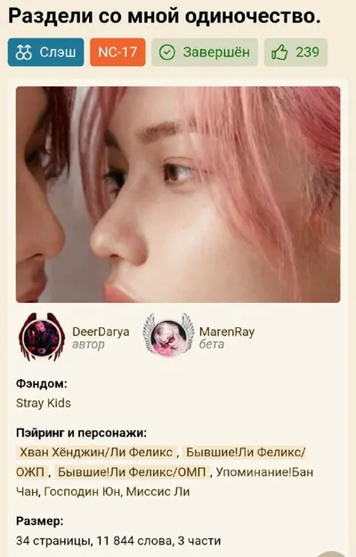 🫧 | #Хенликсы #ОЖП #ОМП Название: Раздели со мной одиночество. Автор: DeerDarya Рейтинг: #NC17 Размер: #миди | 3 части • 34 стр Статус: #Завершён 🖇Ссылка: https://ficbook.net/readfic/019ac1