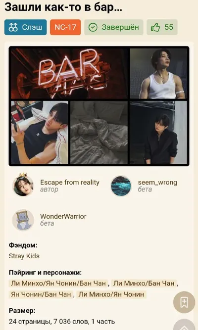 🫧 | #тройник #Банхо #Минчоны #Чанчоны Название: Зашли как-то в бар… Автор: Escape from reality Рейтинг: #NC17 Размер: #миди | 1 часть • 24 стр Статус: #Завершён 🖇Ссылка: https://ficbook.ne
