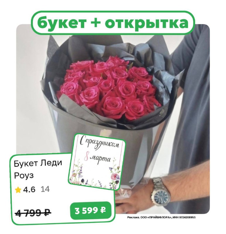 Flor2u приготовил праздничную скидку -25% на первый и все повторные заказы в приложении + можно заказать букет заранее, удобно 🤩 Забирайте по промокоду ➡️ WWV_854RRR8 *Промокод суммируется со скидк
