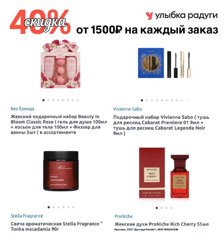 УЛЫБКА РАДУГИ 🤩 СКИДКА ДО 8 МАРТА 🤩 РАДОСТЬ191 — 40% от 1500₽ на каждый заказ 🤩Сработает на все товары, в том числе со скидками, при условии, если выгода по промокоду выше, чем скидка на товар на