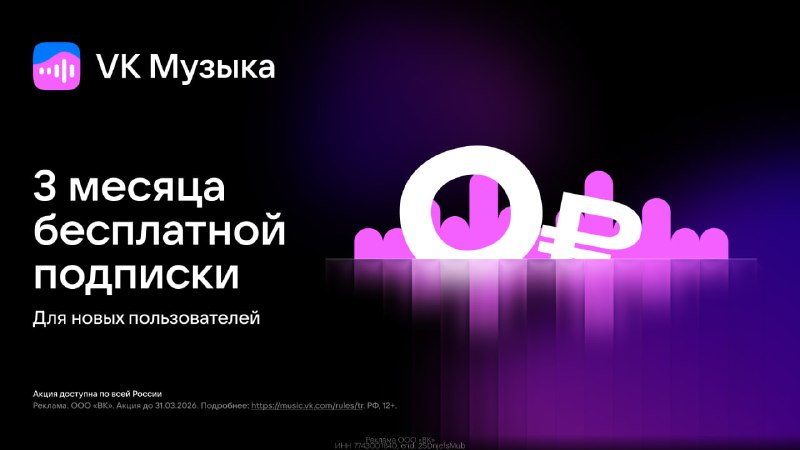 🎵 VK Музыка — 3 месяца БЕСПЛАТНО Слушаем любимые треки даже в фоновом режиме и не прерываемся на рекламу! 1. Переходим по ссылке: https://gtblg.ru/Saa2y?erid=2SDnjefsMub 2. Вводим промокод 👉🏻 G