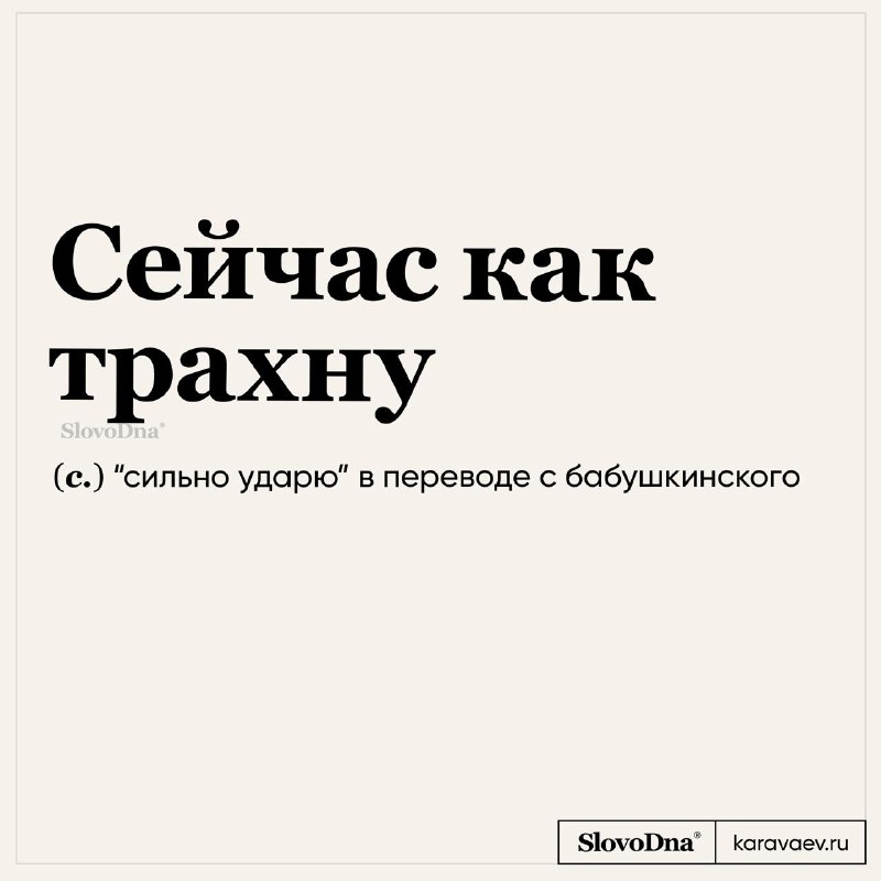 Сейчас как трахну! — "сильно ударю" в переводе с бабушкинского Переводчик с бабушкинского См.также: АХ какая женщина