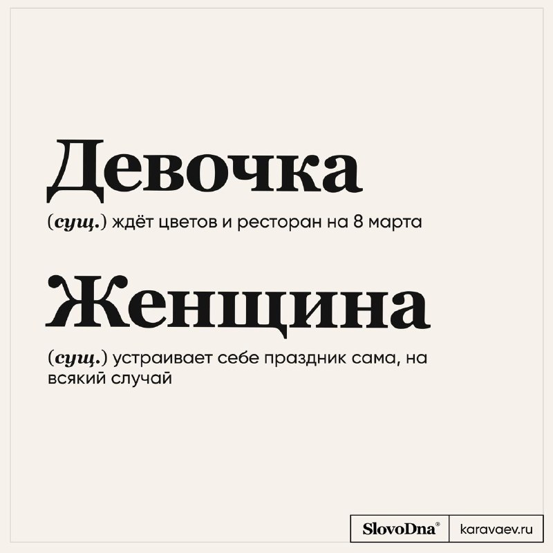 Девочка: ждёт цветов и ресторан на 8 марта; Женщина: устраивает себе праздник сама, на всякий случай с 8 марта, наши дорогие и прекрасные 🌷