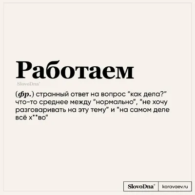 Работаем — странный ответ на вопрос "как дела?" что-то среднее между "нормально", "не хочу разговаривать на эту тему" и "на самом деле всё х**во» Переводы фраз на реальный язык. См.также: В смысле?