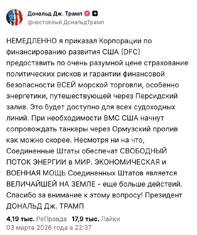 Трамп начал продавать страховку для танкеров в Ормузском проливе во время войны, которую сам развязал Американские военные корабли будут сопровождать все суда, а страховку Вашингтон обещает по «вполн