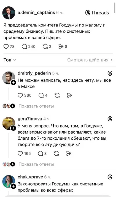 Депутат от «Новых людей» Александр Демин решил спросить у малого бизнеса, чем ему помочь. В запрещенных Threads. Ну ему ответили. Кстати, недавно смотрели увлекательный и очень активный запретграм кол