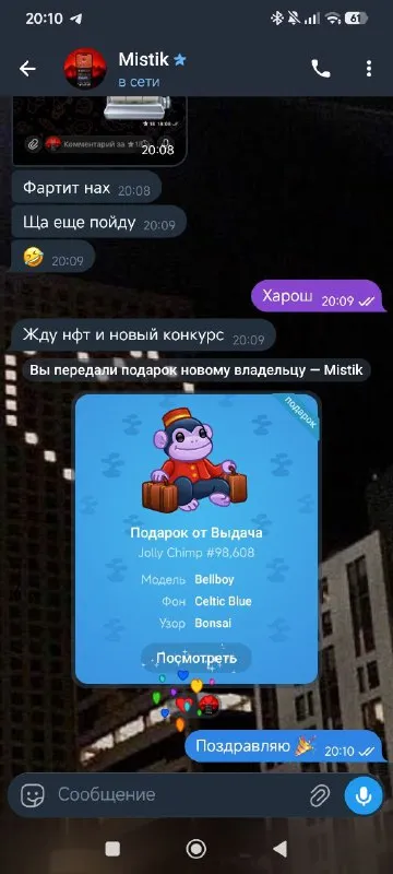 Крутая обезьянка 🎁 t.me/nft/JollyChimp-98608 🎰🎰🎰 - 1 раз 😉 Стоимость - 18⭐️ ⭐️Купить звёзды с 50% скидкой в @tony_starsbot 👨💻Крутить в комментариях под постом 📥 Только под постом, за вы