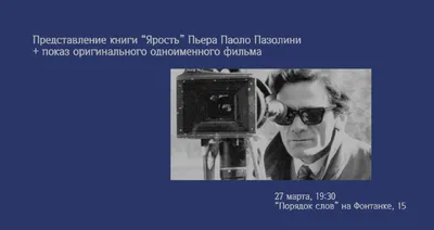 27 марта, 19:30: представление книги «Ярость» Пьера Паоло Пазолини, а также показ оригинального одноименного фильма Фильм «Ярость» (1963) возник как художественный эксперимент на стыке документальног