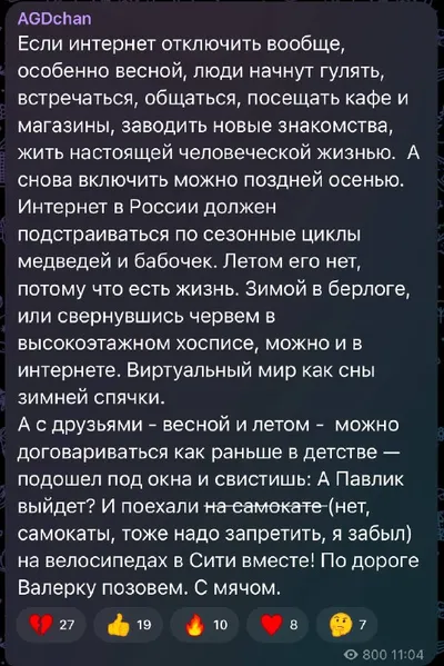 Дугин пишет, что интернет в России лучше отключать по циклам «медведей и бабочек», чтобы каждый гулял, веселился на поле и встречался с друзьями в живую. Играл в мяч. Есть такое ощущение, что наши ста