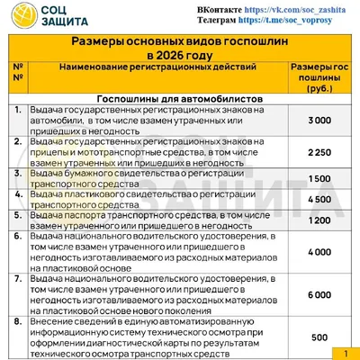 Размеры основных видов госпошлин в 2026 году: для автомобилистов, в органах ЗАГС, за выдачу паспортов и регистрацию права собственности на недвижимость. 1️⃣2️⃣3️⃣4️⃣5️⃣6️⃣7️⃣ - подписаться на канал.