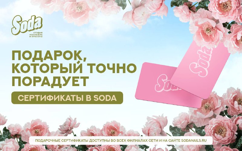 Мода и красотаСеть студий красоты SODA / Сода Маникюр Педикюр Брови Макияж Волосы Массаж Скидка на первый визит 15% по промокоду “TELEGRAM2026” (от 1000₽, кроме окрашивания и уходов)* РКН № 7043279747 125 студий в Москве и МО, Питере и Казани http://sodanails.ru