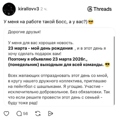 Идеальные боссы все-таки существуют — юзер в сети похвастался своим начальником, который в честь своего дня рождения устроил всем выходной. Только один вопрос: как к ним устроиться? 😞